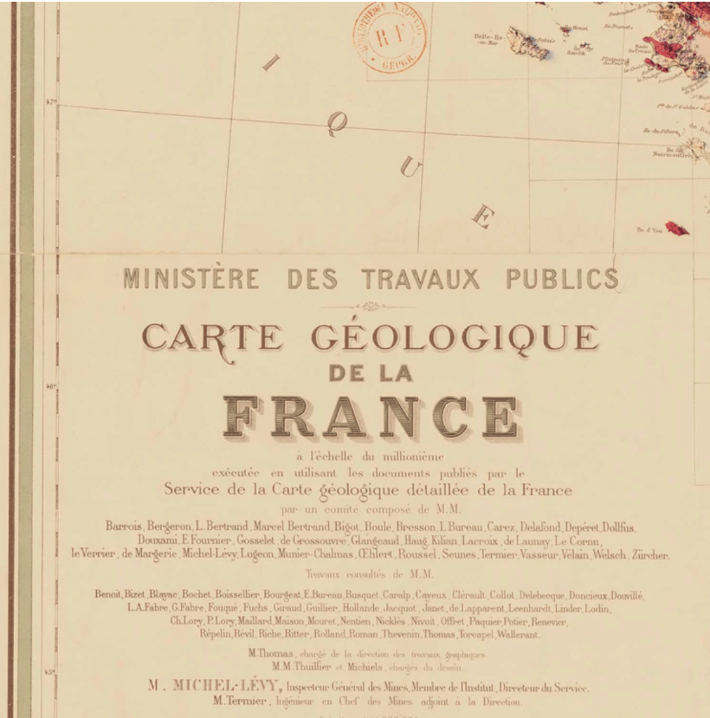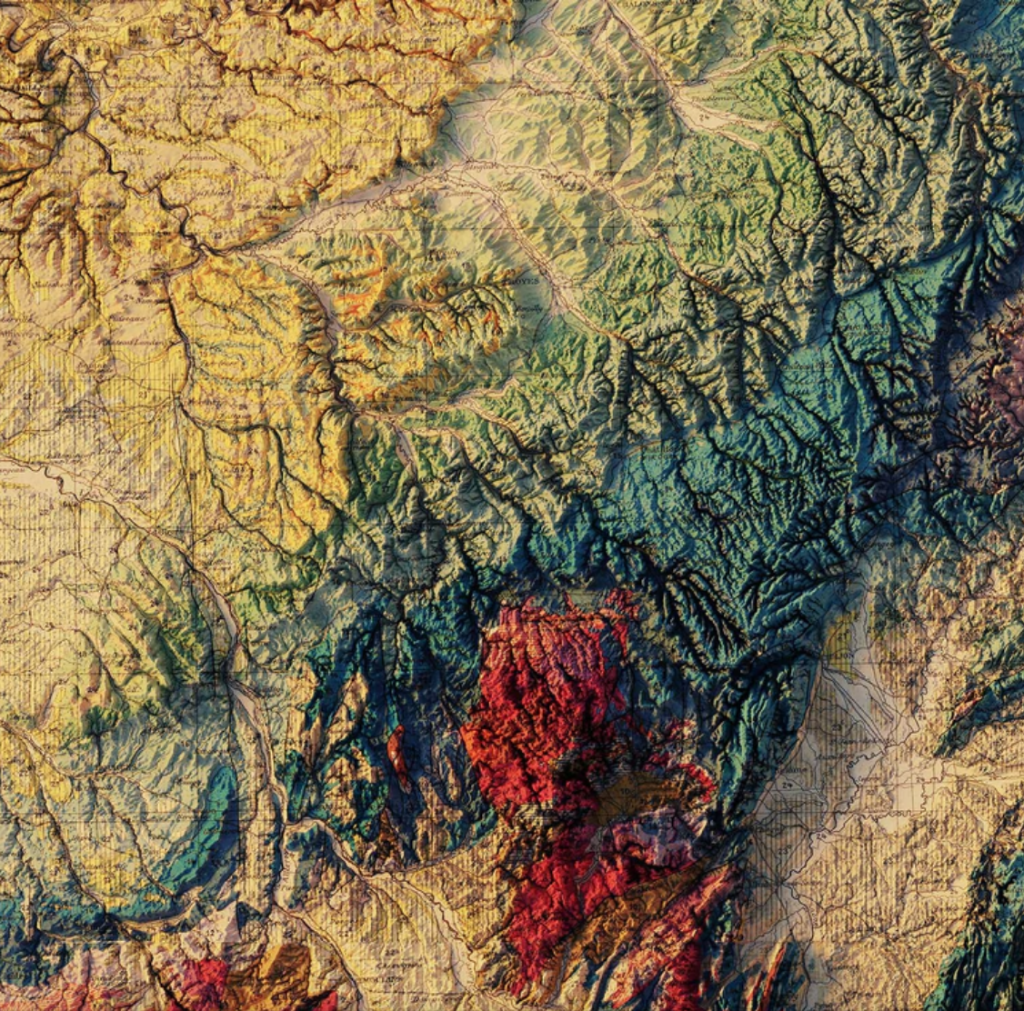 La France est une terre vivante qui présente un sous-sol d’une grande variété et d’une infinie richesse. En voici une carte géologique en relief, à l’échelle du millionième qui date de 1905.