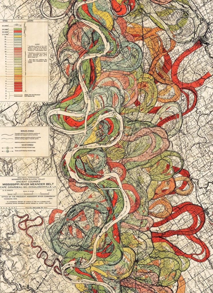 Pour les cartophiles, la vue du bas Mississippi de 1944 par Harold Fisk est une œuvre de référence. Le géologue a dessiné la rivière avec des détails et une précision étonnantes, en superposant des photos aériennes et des cartes locales.