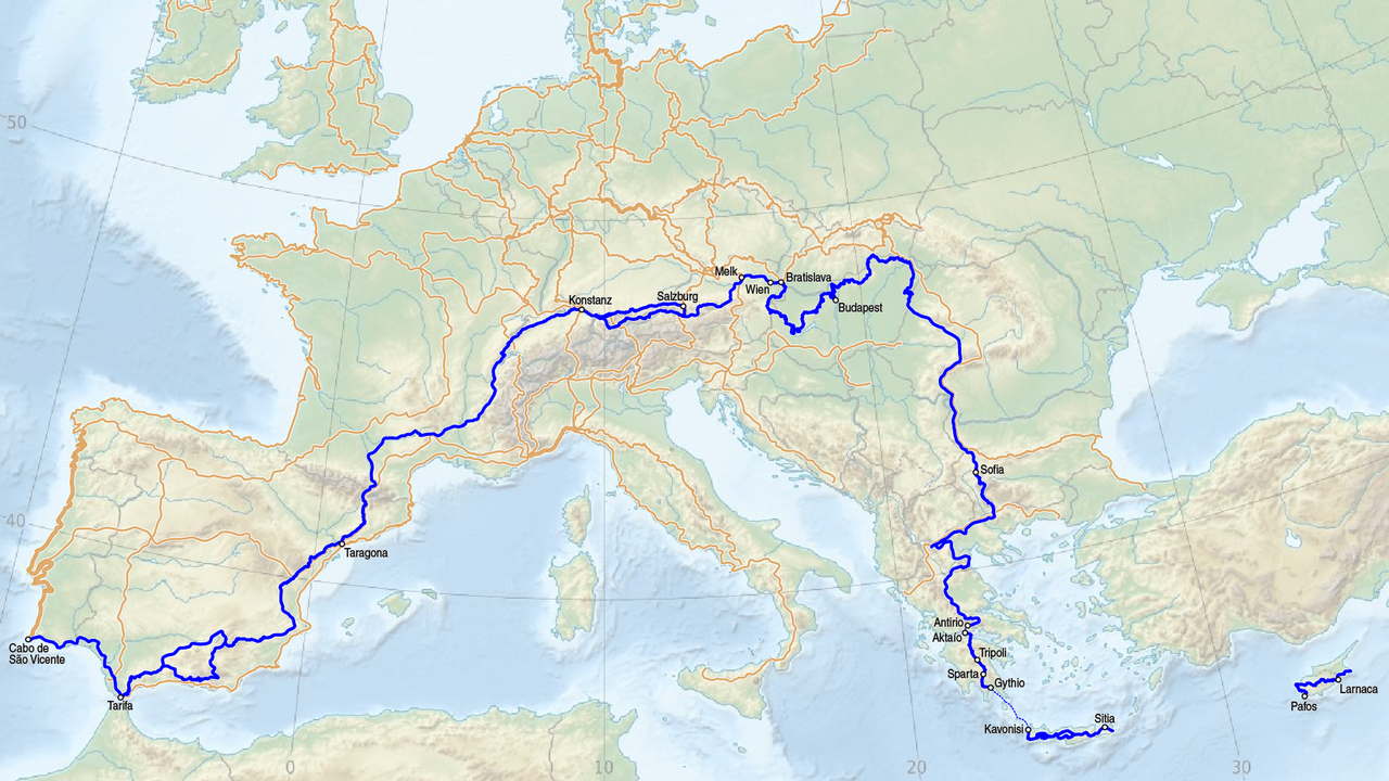 En Grèce, vous retrouvez les panneaux E4, et vous déroulez jusqu’à la pointe sud du Peloponnèse, entre météores et temples antiques. Vous passez Sparte et vous devinez l’île de Cythère, au loin. Crevés mais heureux. Peut-être un peu de corne aux pieds.